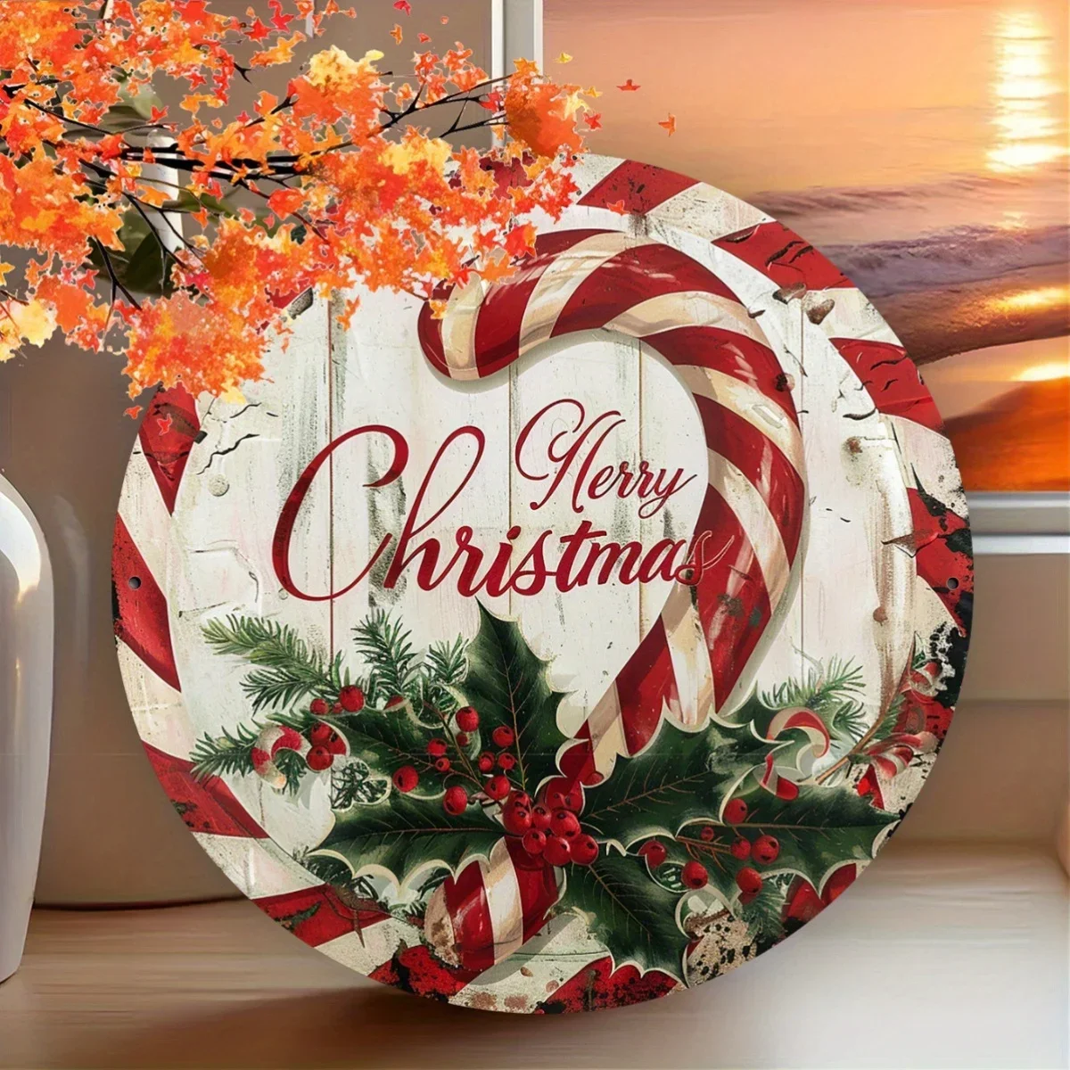1pc Vintage Aluminum Merry Christmas Sign, 8x8 inches, Round Festive Wall Decor with Candy Cane and Holly Design for Home