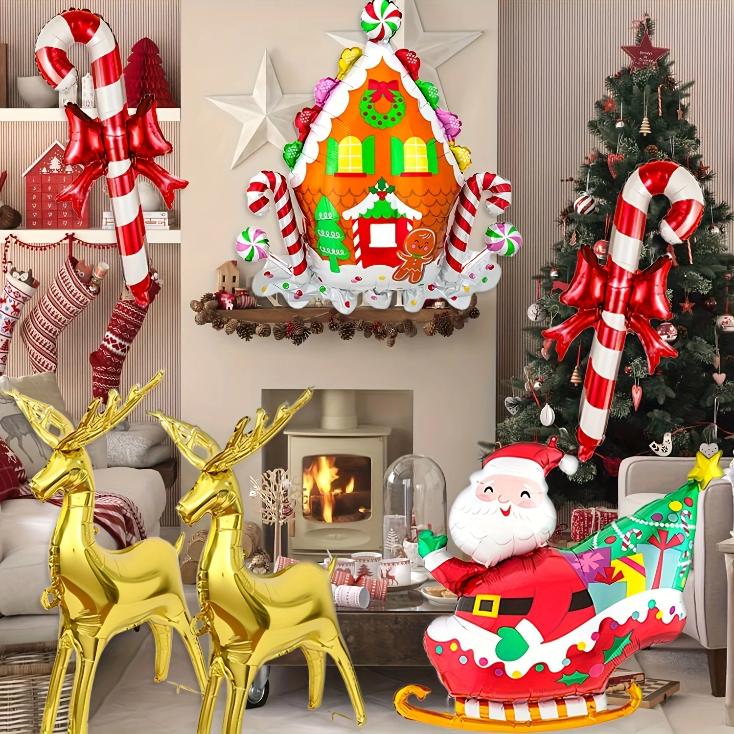 6pcs Christmas Balloons Giant Christmas Decorative Balloons Standing Reindeer Sleigh Gingerbread House Holiday Party Decorations