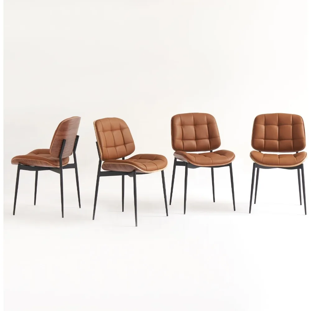Set of 4 Mid-Century Modern Dining Chairs – Brown Faux Leather Seats with Checkered Soft Cushions and Walnut Grain Backs