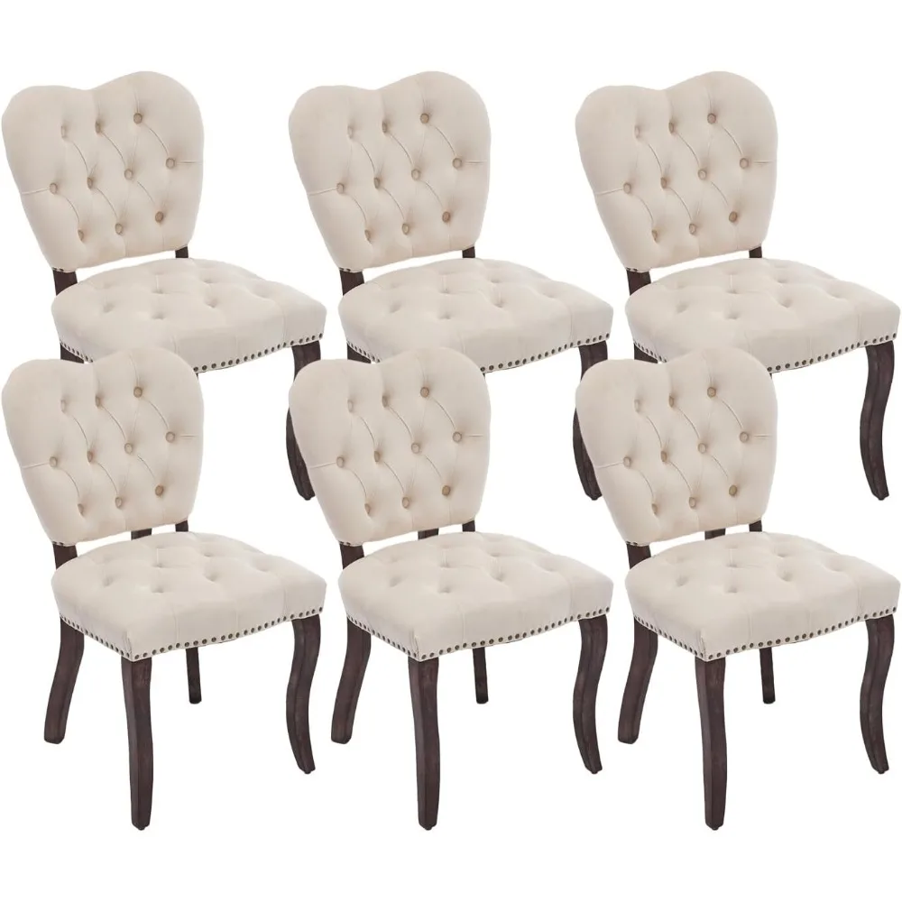 French Vintage Tufted Dining Chairs, Set of 6 Beige Velvet Upholstered with Solid Wood Legs, Ideal for Kitchen, Dining Room