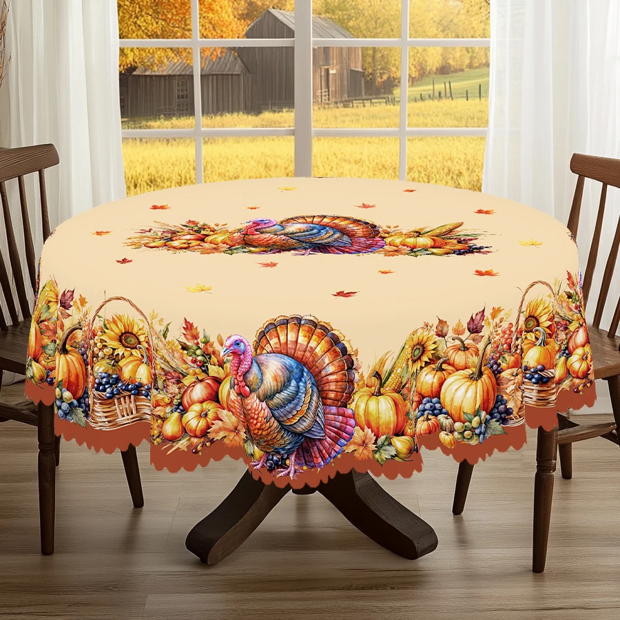 1 Piece of Autumn Thanksgiving and Autumn Harvest Festival Themed Printed Tablecloth, Vintage Country Farmhouse Style, Turkey and Pumpkin Pattern Design, Suitable for Holiday Gatherings, Camping