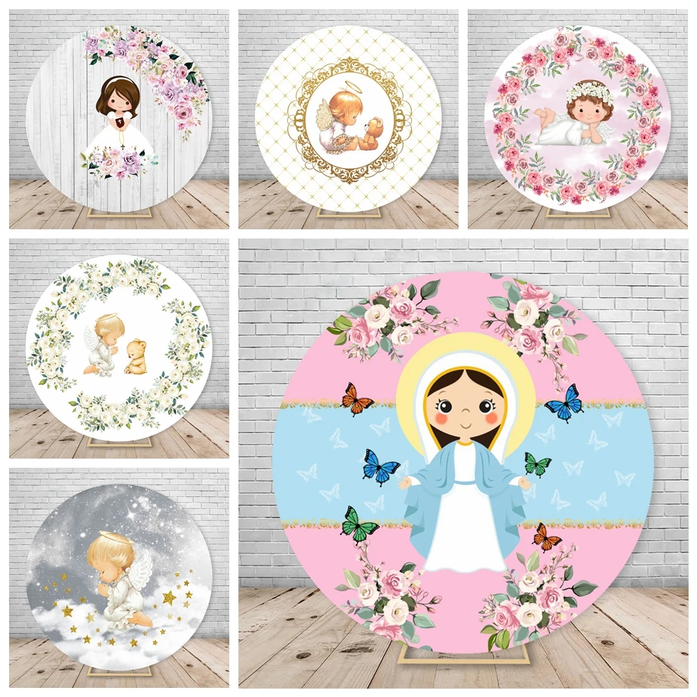 Boy Girl Baptism Round Backdrop Covers Pink Flower Angel Baby Shower Christening Circle Background My First Communion Decoration  Read more