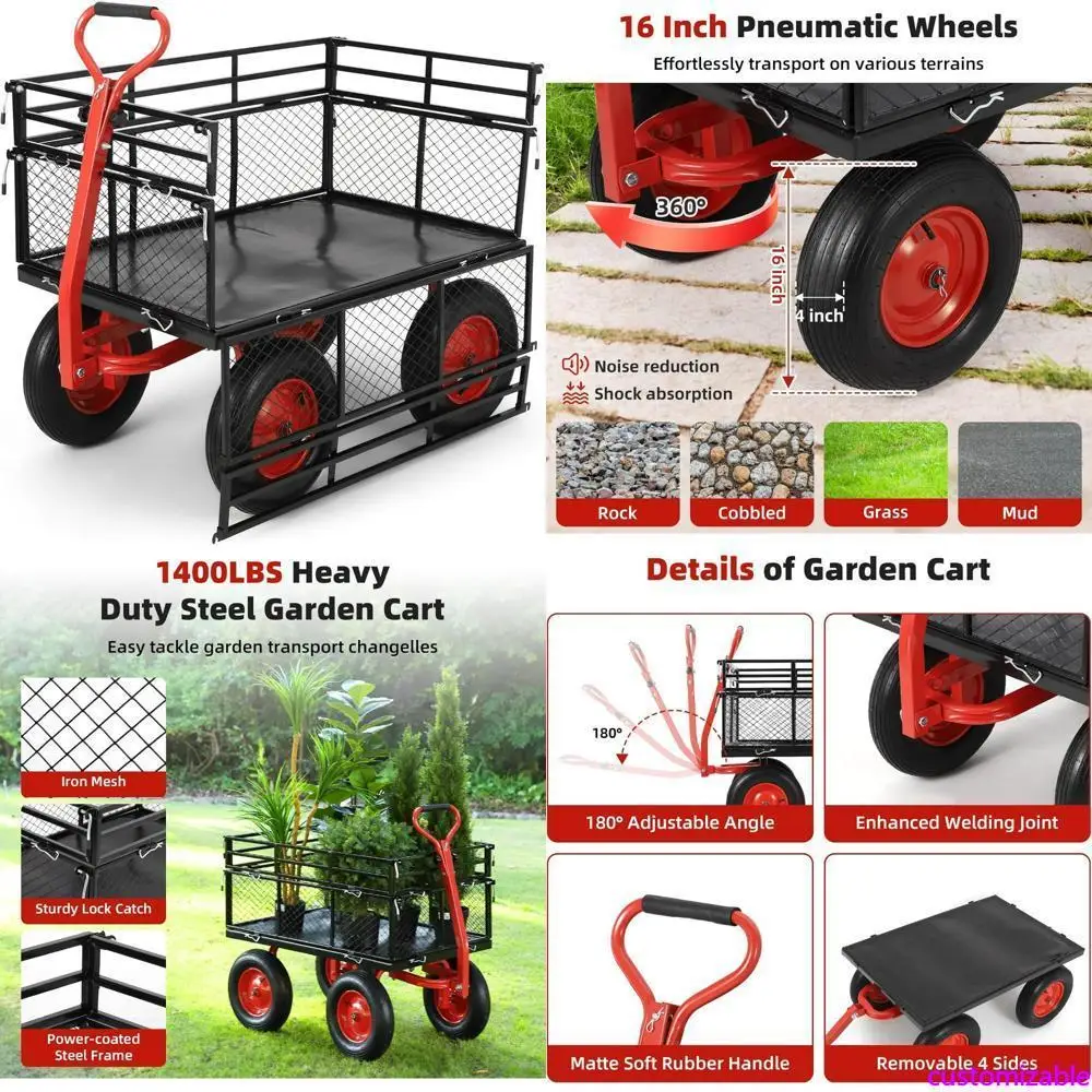Heavy-Duty Steel Garden Cart with 1400 lbs Capacity, Removable Sides, Dual Handle, and 16 Inch Tires