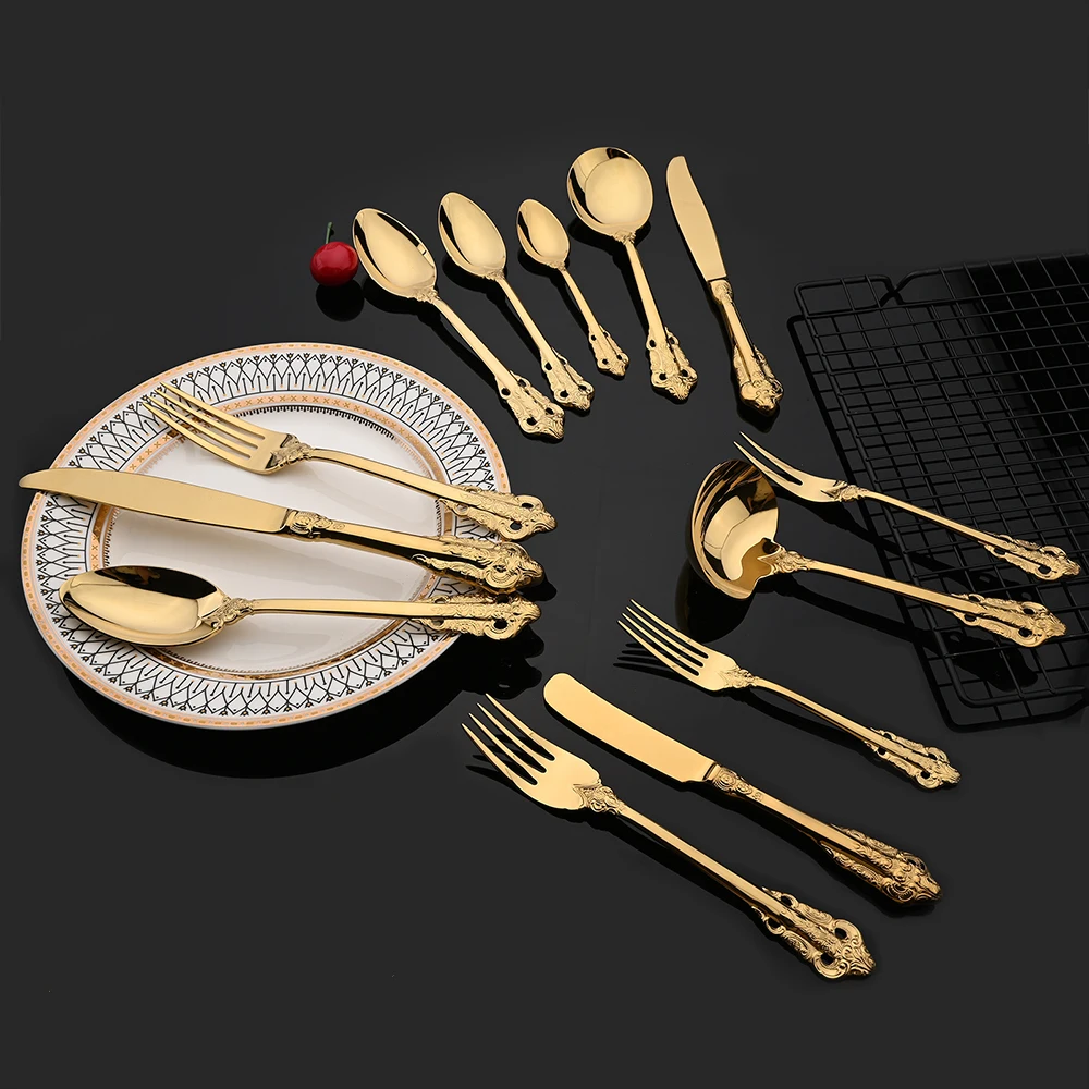 Vintage Western Gold Plated Cutlery Dining Knife Fruit Fork Teaspoon Butter Knife Set Luxury Dinnerware Engraving Tableware Set