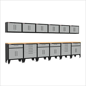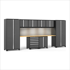 This 10-piece PRO 3.0 garage cabinet system with bamboo worktop is made from 18 gauge steel fully welded frames and 19 gauge double wall doors.
