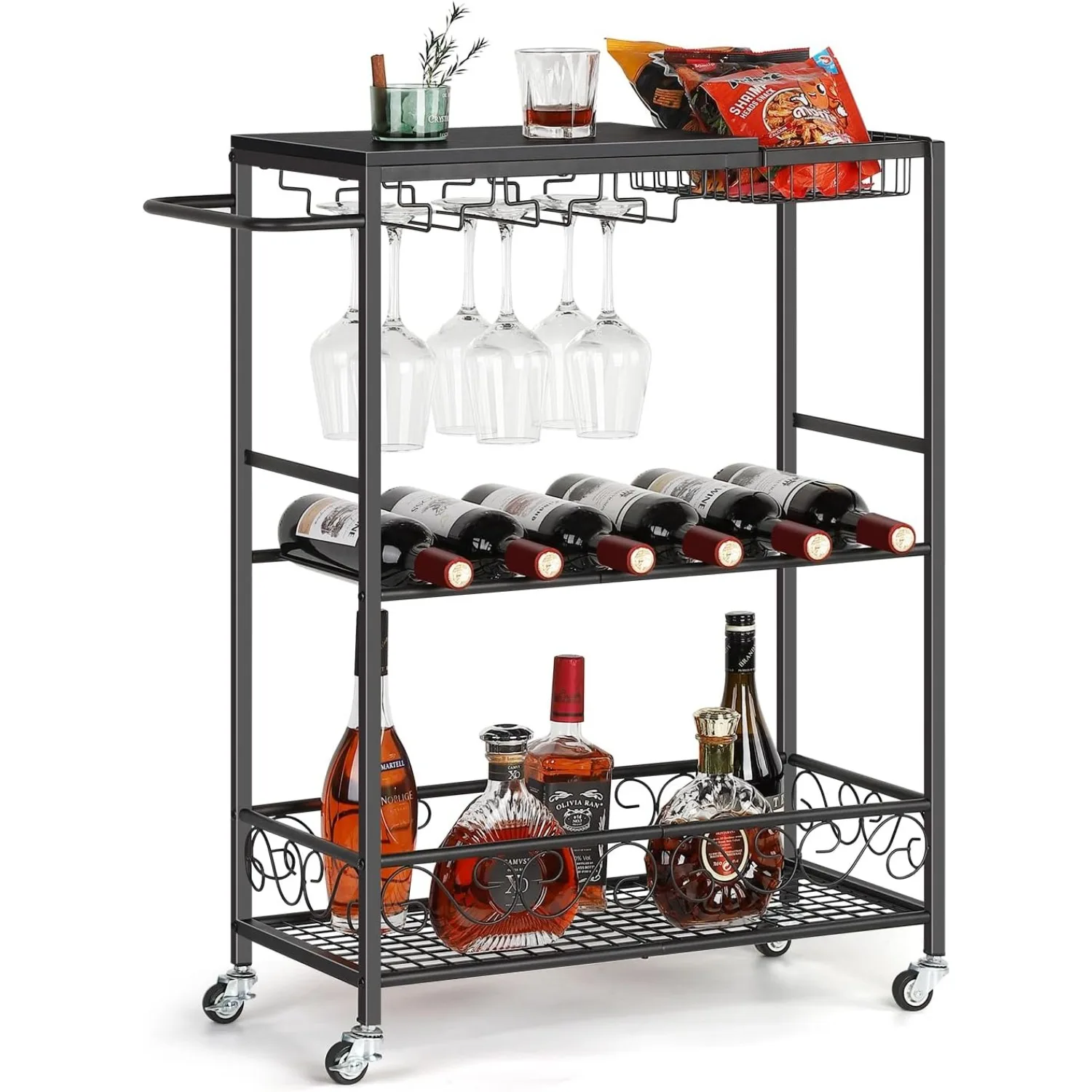 Shinoske Bar Cart, 3-Tier Home Bar Serving Cart with Wheels and Handle, Rolling Kitchen Cart with Wine Rack and Glass Holder