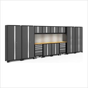 This 10-piece PRO 3.0 garage cabinet system with bamboo worktop is made from 18 gauge steel fully welded frames and 19 gauge double wall doors.