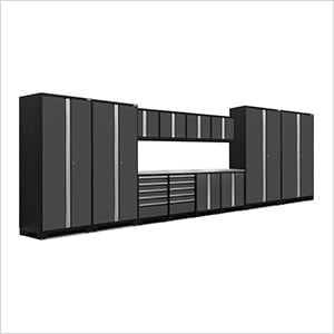 The 14-piece PRO 3.0 series cabinet set with stainless steel worktops is made from 18 gauge steel fully welded frames and 19 gauge double wall doors.