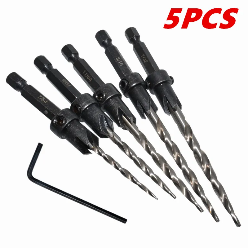 Set Of 5, Countersink Set, Countersink HSS Conical Countersink With 1 Hex Wrench, Woodworking Countersink Bit, 7/64", 9/64", 11/