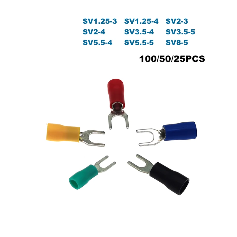 100/50/25Pcs Spade Insulated Furcate Crimp Terminals SV1.25~SV8 Wire Cable Connector Lug Ferrules 0.5-10mm2 22-8AWG