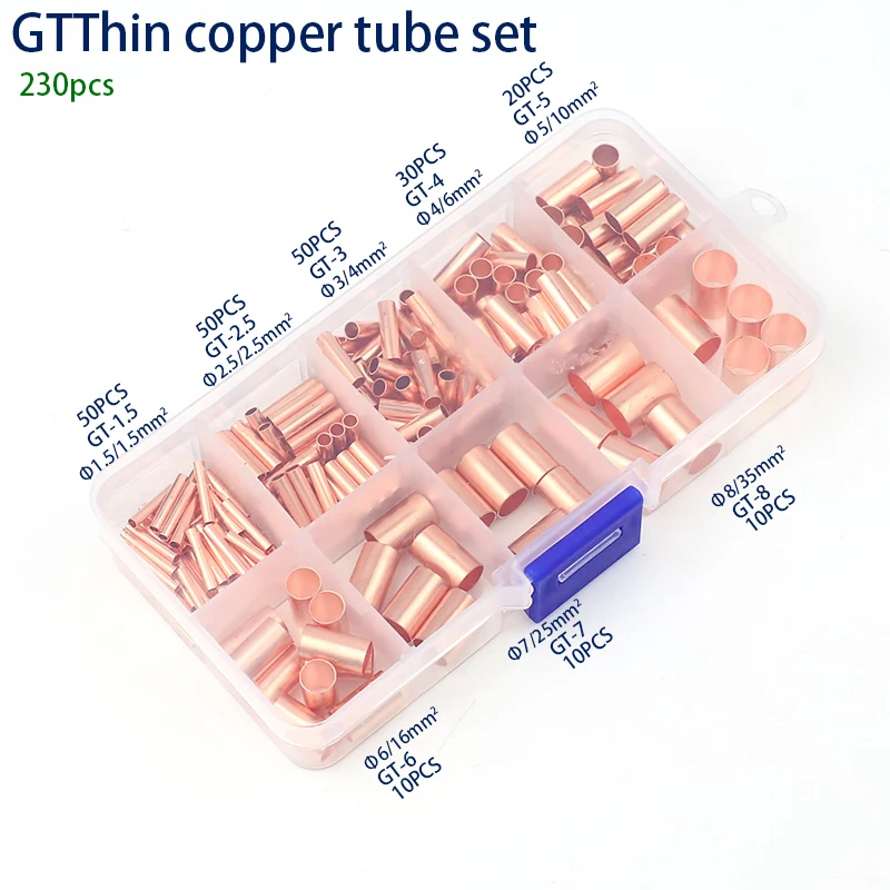 250/230/100PCS/20PCS Wire Ferrules Kit 8/7 Size Copper Crimp Connector Non Insulated Electrical Butt Terminal Assortment Kit