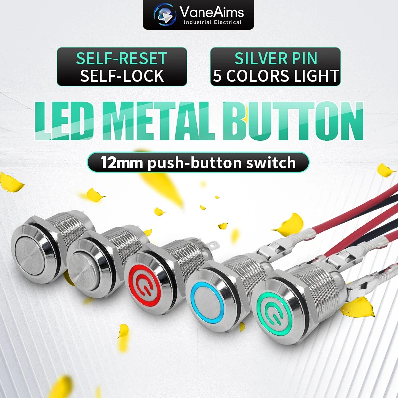 Metal Push button switch 12mm latching power Momentary button with LED light 3-6V/12V/24V/220V jog switch Red yellow blue green