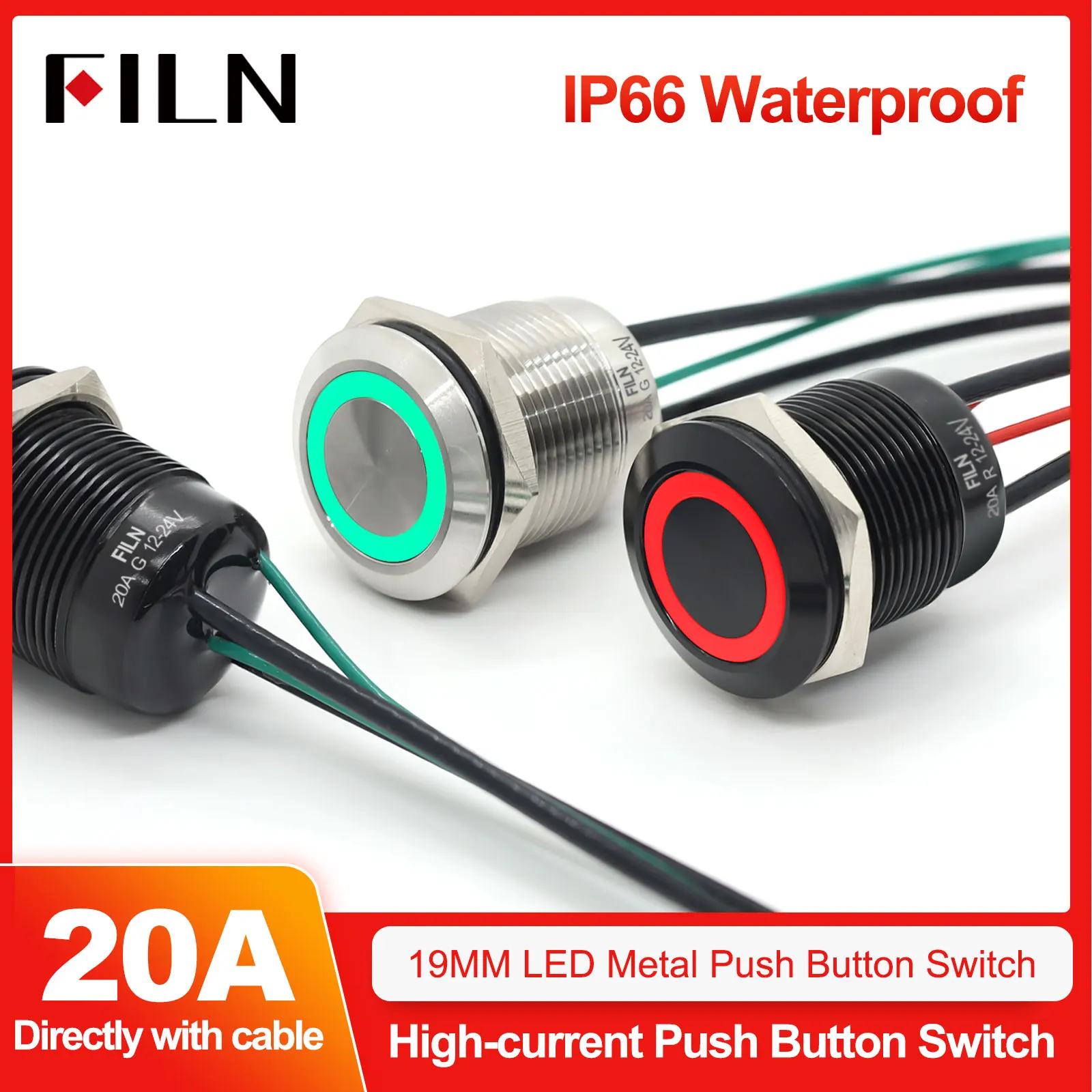 FILN 19MM 20A 12V 24V 110V 220V LATCHING MOMENTARY Flat Ring Round Push Button Switch IP66 Metal Stainless Steel with 20cm Wire