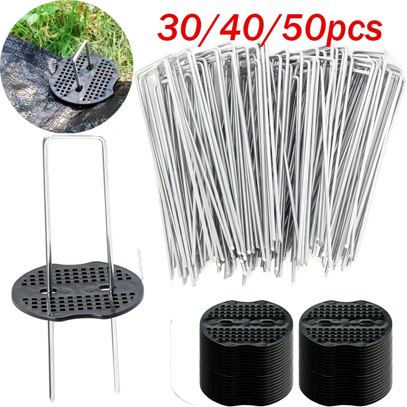 40/50PCS Garden Pegs U-shaped Ground Pegs Heavy Duty Metal Pins Spikes Ground Staple with 30pcs Buffer Washers for Securing Weed