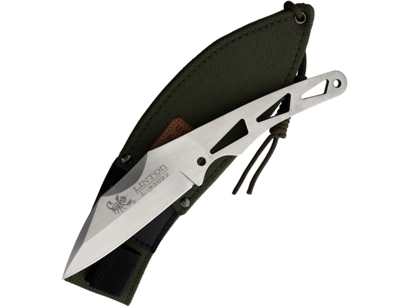 Linton Cutlery Skeletonized Fixed Blade Knife w/ Sheath 10.63in Overall 4.75in Satin Stainless Blade Skeletonized Handle Nylon Sheath L92022. One-piece construction. Lanyard hole. Skeletonized. OD green nylon belt sheath. Specifications for Linton...  Read more