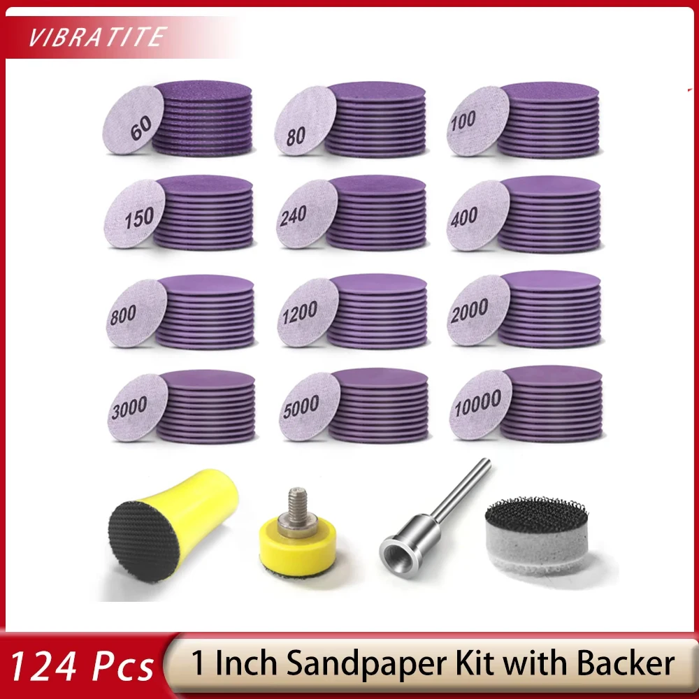 1 Inch 124Pcs Wet Dry Sandpaper Kit Hook&Loop with Polishing Pads and Interface Pad for Grinder Rotary Tools and Wood Grinding