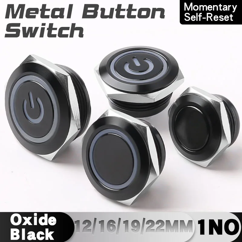 12/16/19/22mm Short Stroke Oxide Blcak Shell Metal Button Switch Waterproof Flat Head With Power LED Light Momentary 1NO 6V 24V