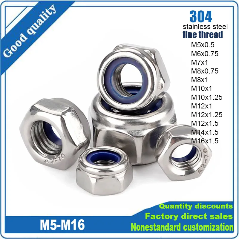 Fine Thread M5 M6 M7 M8 M10 M12 M14 M16 Pitch 0.5~1.5mm 304 Stainless Steel Nylon Insert Lock Nut Hexagon Self-locking Locknut