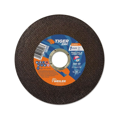 Weiler Tiger Zirconia Ultracut Thin Cutting Wheel, 5", 7/8" Arbor, 60, 12200 rpm, 50/PK (804-58006)