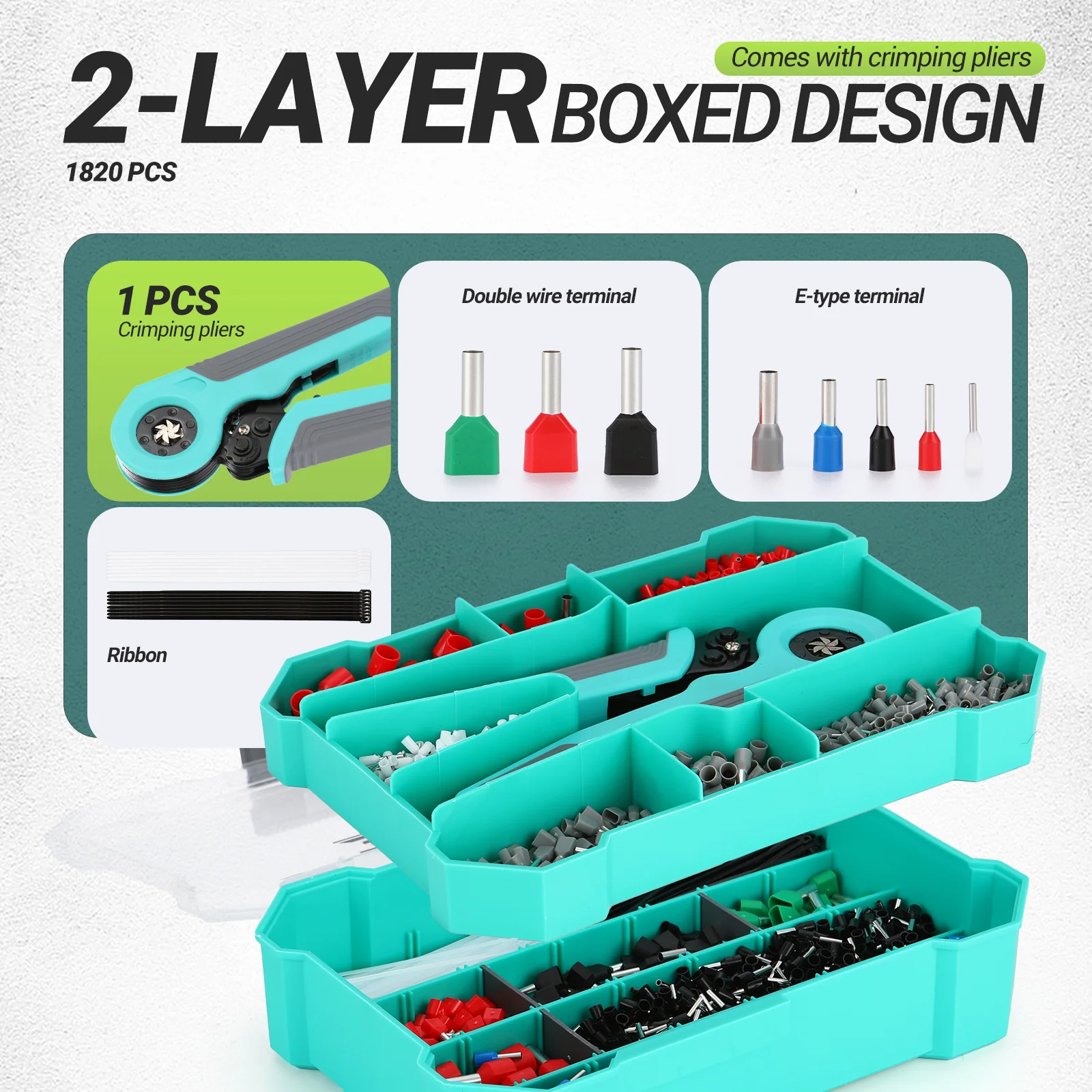Ferrule Crimping Tool Kit Hexagonal Sawtooth Self-Adjustable Ratchet Wire Terminals Crimper Kit With 1900 Tubular Terminals Set