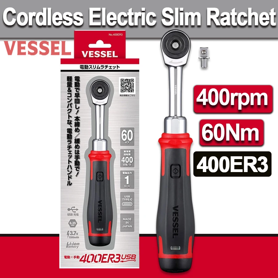 VESSEL 3.7V Cordless Electric Slim Ratchet Wrench Screwdriver Handle USB-Type-C Lithium-ion Rechargeable NO.400ER3