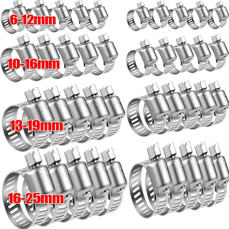 10/60Pcs Hose Clamps Stainless Steel Adjustable Screw Faucet Water Pipes Fasteners Fuel Tube Line Worm Gear Clip Hoop Plier Tool