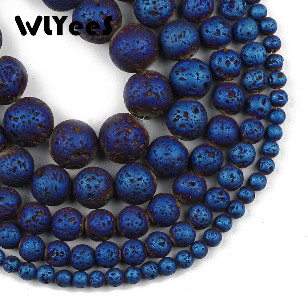 WLYeeS Round Plated Blue Lava Stone Beads 4 6 8 10mm Natural Volcanic Rock Loose Beads For Jewelry Making DIY Bracelet Necklace