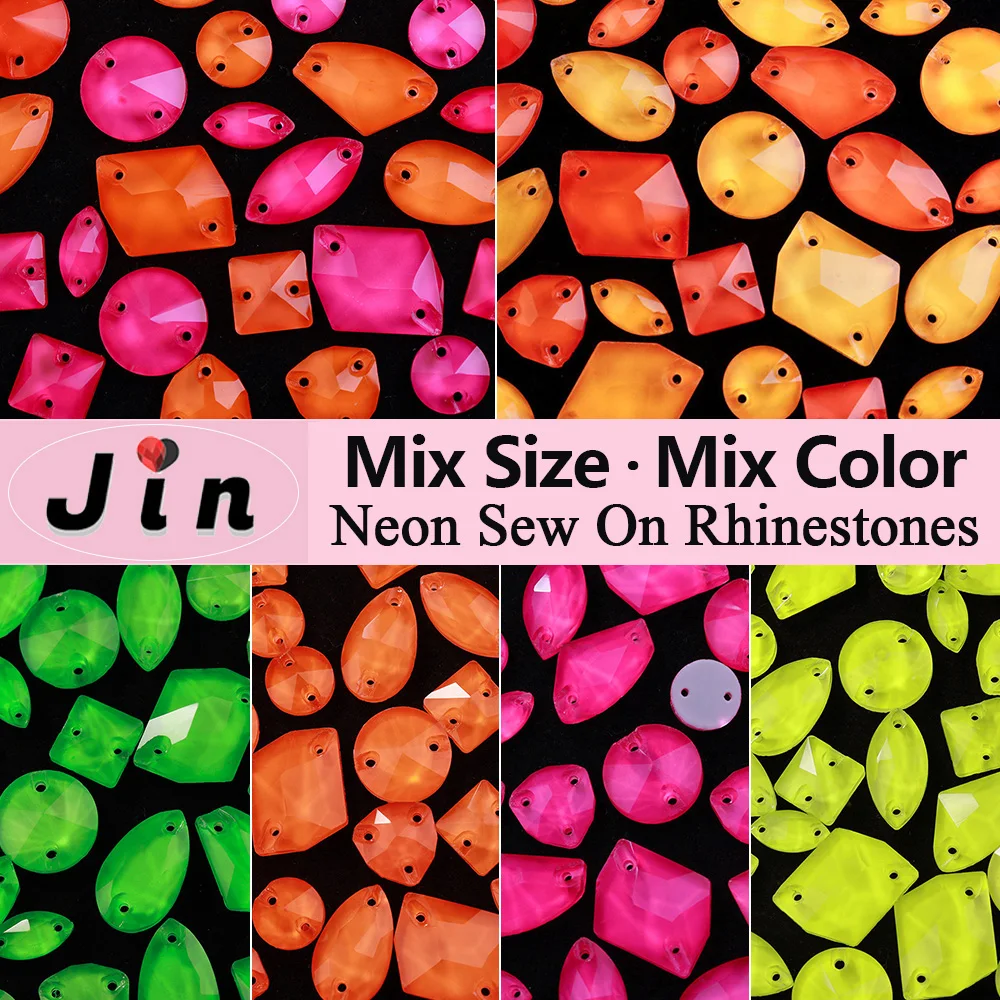 JIN 20/50/100PCS Mix Size Glass Neon Sew On Rhinestones Orange Strass Crystal Flatback Sewing Stones for Clothes Costumes Dress