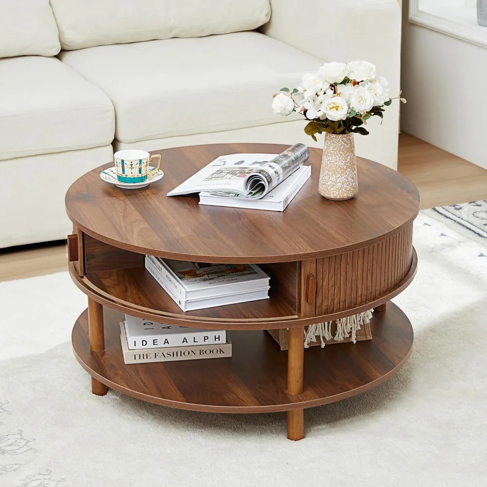 31.5” Round Coffee Table with Storage, Mid Century Modern 2 Tier Coffee Table with Tambour Sliding Door, Solid Wood Legs Fluted