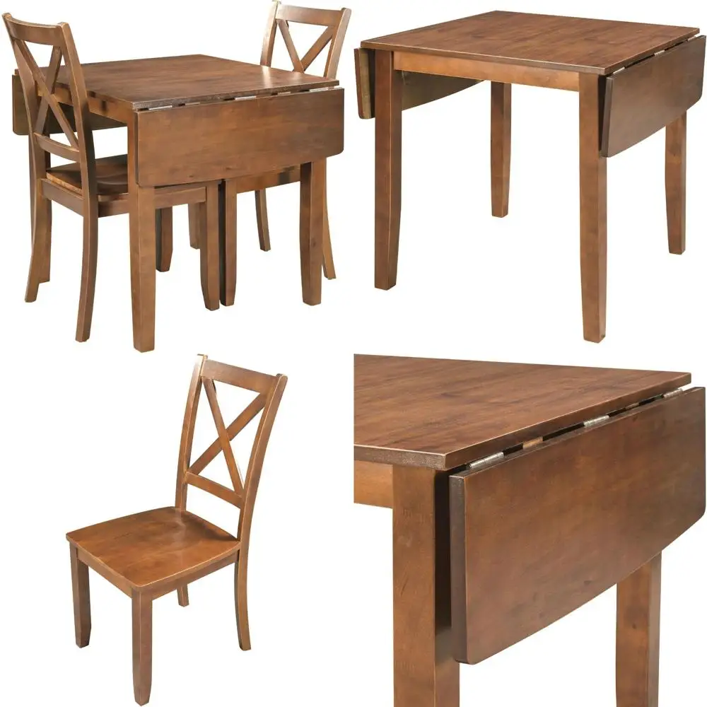 space-saving 3-piece drop leaf dining table with 2 x-back chairs in brown for breakfast nook