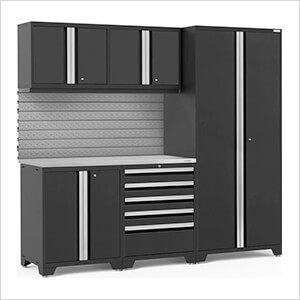 NewAge Garage Cabinets PRO Series Black 6-Piece Set with Stainless Steel Top and Slatwall