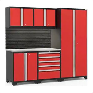 NewAge Garage Cabinets PRO Series Red 6-Piece Set with Stainless Steel Top, Slatwall and LED Lights