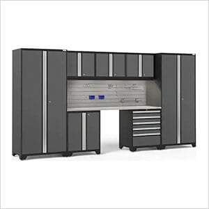 The NewAge Pro 3.0 8-piece garage cabinet system with stainless steel worktop is made from 18 gauge steel fully welded frames and 19 gauge double wall doors.