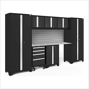 NewAge Garage Cabinets PRO Series Black 8-Piece Set with Stainless Steel Top and Slatwall