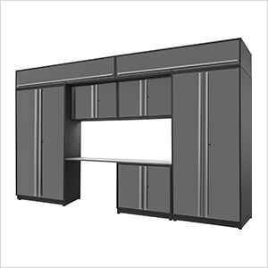 Proslat Garage Cabinets 8-Piece Glossy Grey Cabinet Set with Silver Handles and Stainless Steel Worktop