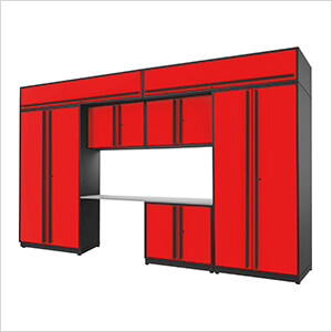 Proslat Garage Cabinets 8-Piece Glossy Red Cabinet Set with Black Handles and Stainless Steel Worktop