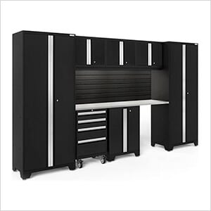 NewAge Garage Cabinets PRO Series Black 8-Piece Set with Stainless Steel Top, Slatwall and LED Lights