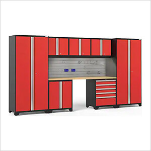 NewAge Garage Cabinets PRO Series Red 8-Piece Set with Bamboo Top, Slatwall Hook Kit and LEDs