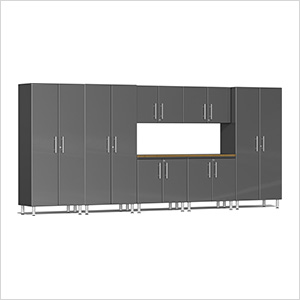 Proslat Garage Cabinets 8-Piece Glossy Grey Cabinet Set with Black Handles and Powder Coated Worktop