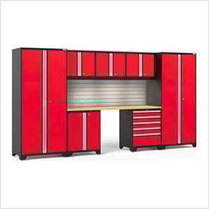 The 8-piece NewAge Pro 3.0 series red garage cabinet system with bamboo worktop is made from 18 gauge steel fully welded frames and 19 gauge double wall doors.