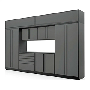 Proslat Garage Cabinets 9-Piece Glossy Grey Cabinet Set with Black Handles and Stainless Steel Worktop