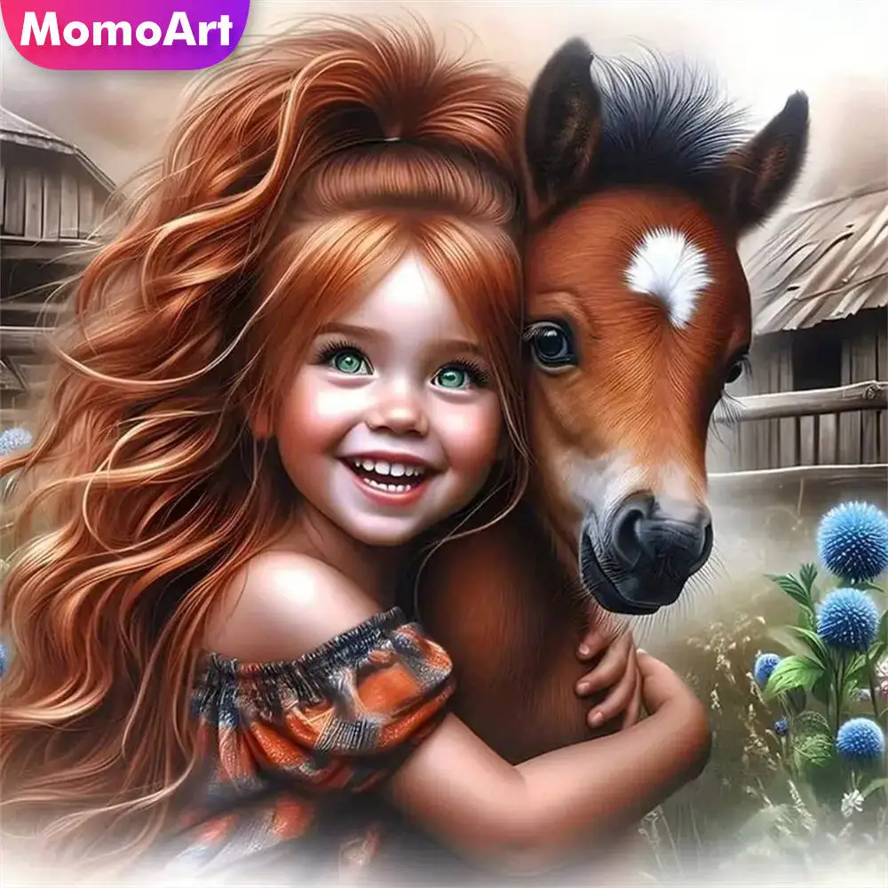 Momoart Girl Diamond Mosaic Portrait DIY Picture Of Rhinestones Painting Horse Animal Embroidery Cartoon Child Gift