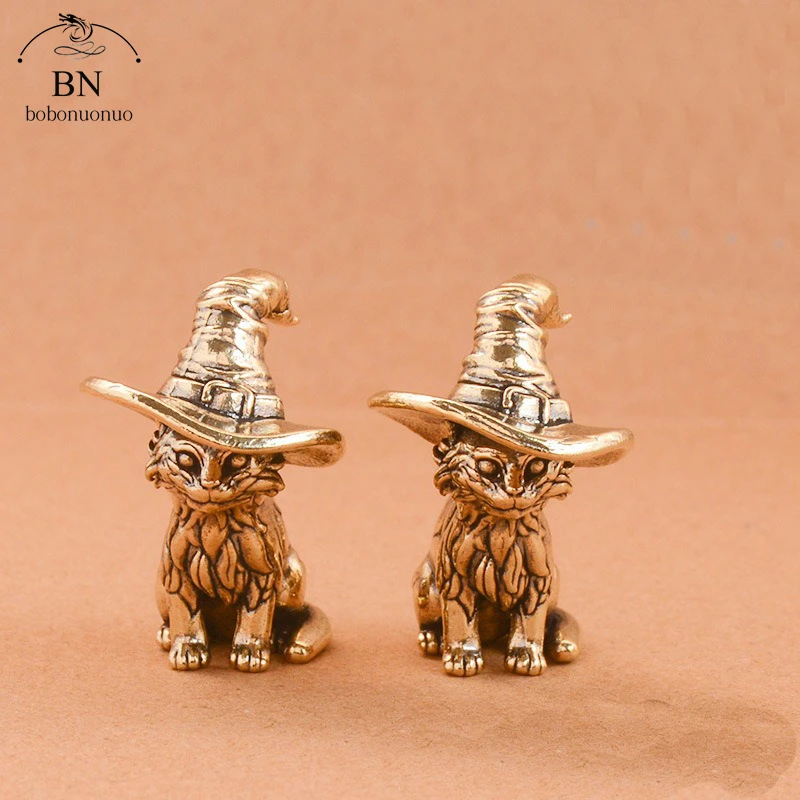 Cute sorcerer Cat Small Statue Creative Solid Brass Childish Animal Kitten Miniature Figurine Ornaments Retro Home Decors
