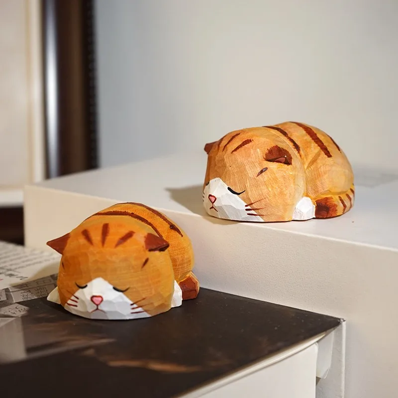 1PC Slumbering Cat Hand Carved Wood Sculpture Dozing Cat Figurines Serene Table Accent Lovely Animal Decor Wooden Home Ornament