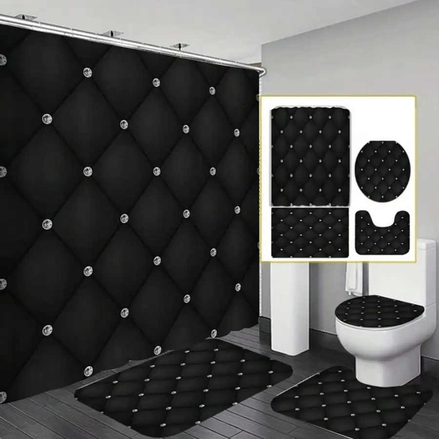 4 Pcs Luxurious Black Quilted Sofa Pattern Bathroom Set Includes 12 Hooks Shower Curtain, Anti-Slip Bath Mat, Toilet Lid Cover