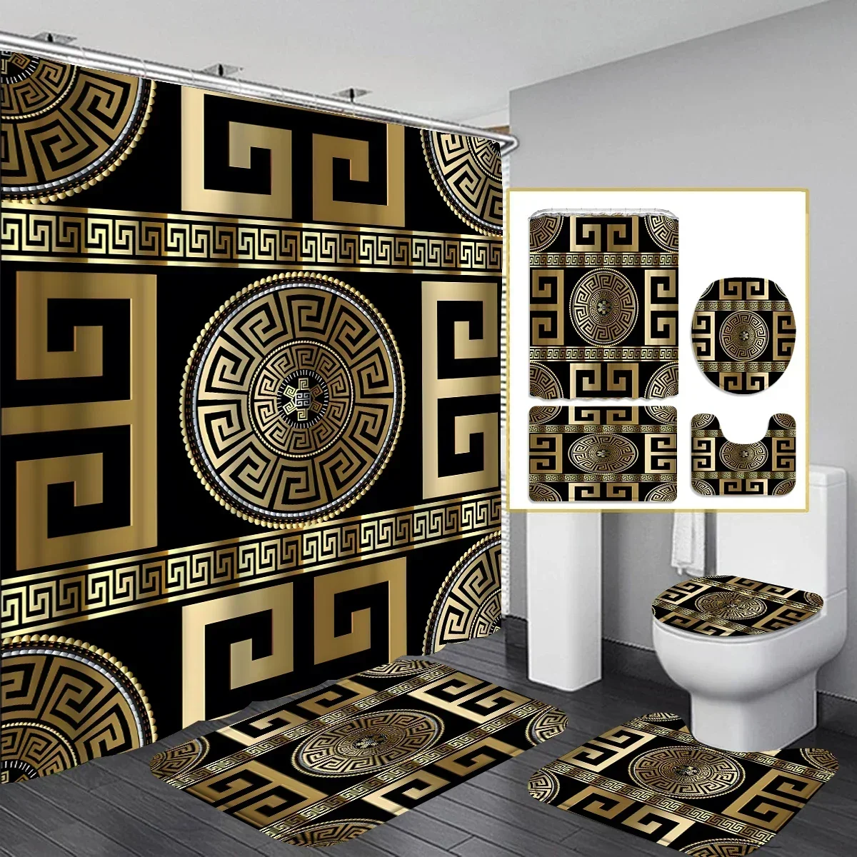 Luxury Black Gold Bathroom Set - Greek Key Pattern Shower Curtain, Non-Slip Rug, U-Shaped Mat, Toilet Seat Cover, Elegant Decor