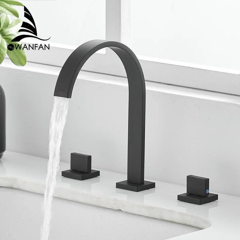 Basin Faucets Brass Polished Black Deck Mounted Square Bathroom Sink Faucets 3 Hole Double Handle Hot And Cold Water Tap LT-109R