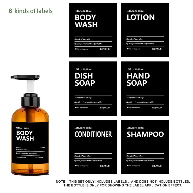 Soap Dispenser Labels Waterproof Black Lotion Label Shampoo Conditioner Body Wash Bathroom Shower Bottle Sticker 6 PCS