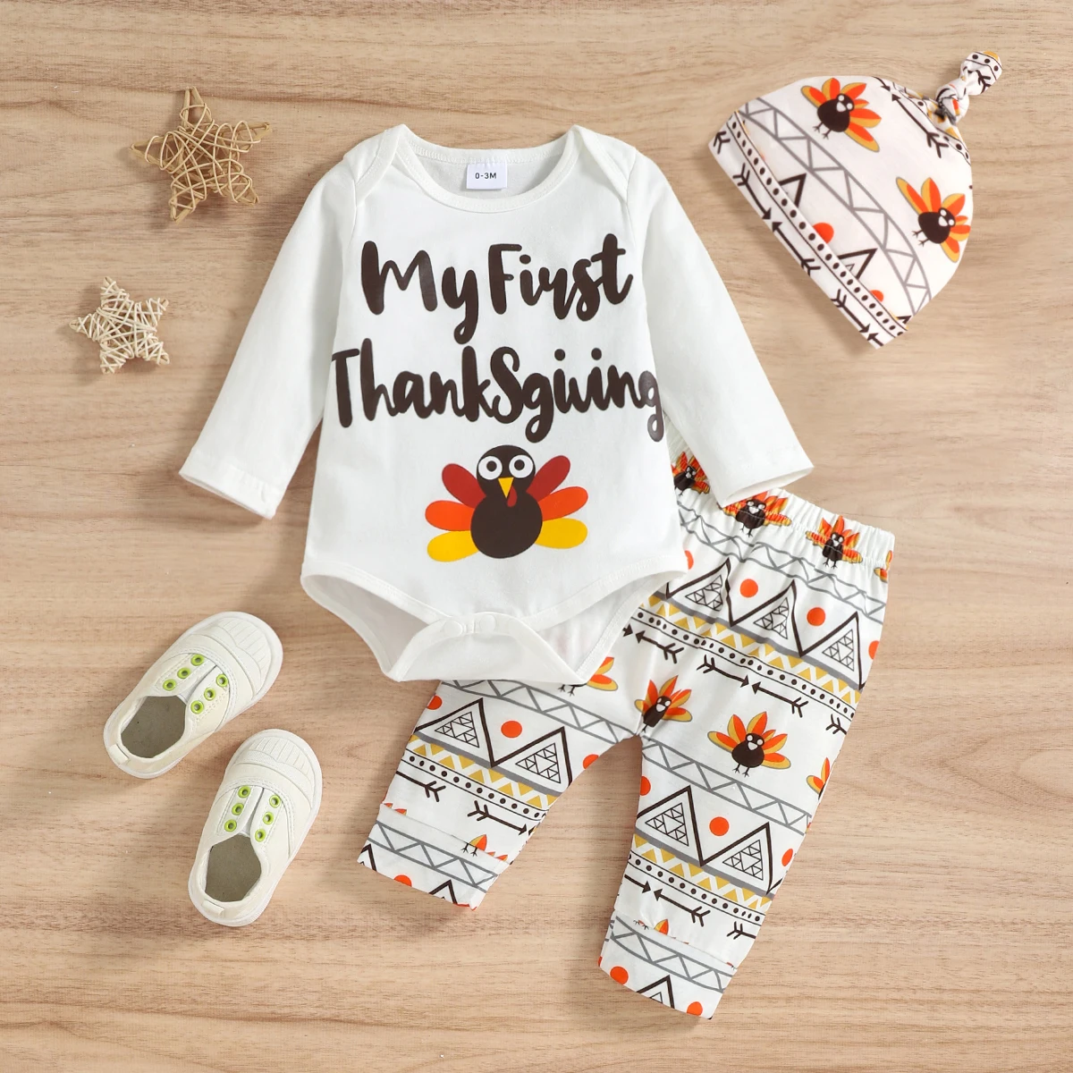 Unisex Baby Casual Thanksgiving Letter Print Triangle Blanket+Pants Two-Piece Set for Spring/Autumn Season