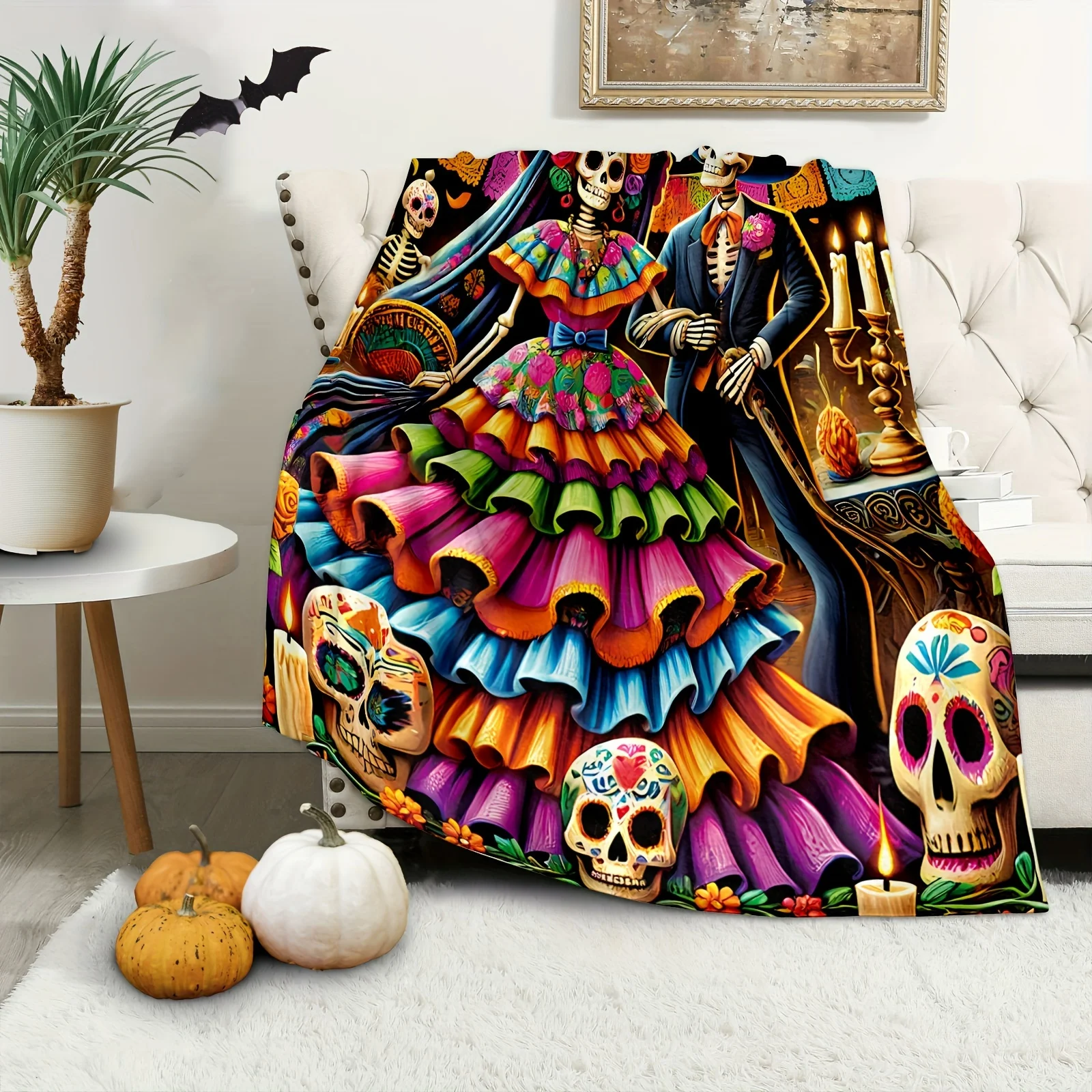 [Day of the Dead Throw Blanket] Vibrant Orange, Black & Blue Flannel Day of the Dead Throw Blanket - Skeleton Couple with Roses